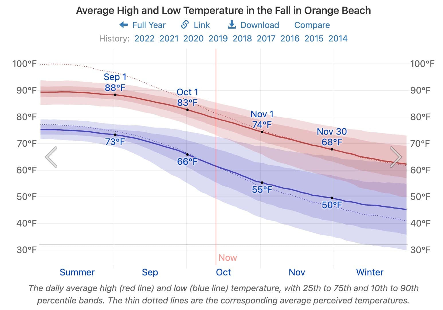 The average water temperature in Gulf Shores ranges from about 68 to 78 degrees year-round, but it can go as low as 50 degrees or as high as 90 degrees. The water is warm enough for a nice swim from May to October, but swimmers should be aware that dangerous rip currents are present.
