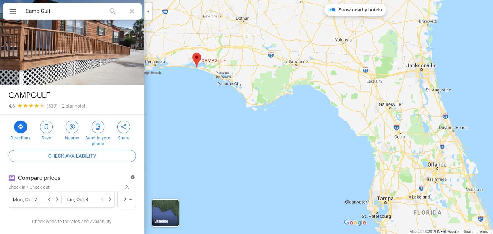 Camp Gulf is one of the largest camping sites in Florida. It’s so well-developed that it’s practically a resort; there are cabins, beach houses, bathhouses, RV sites, activity centers, and public pools.