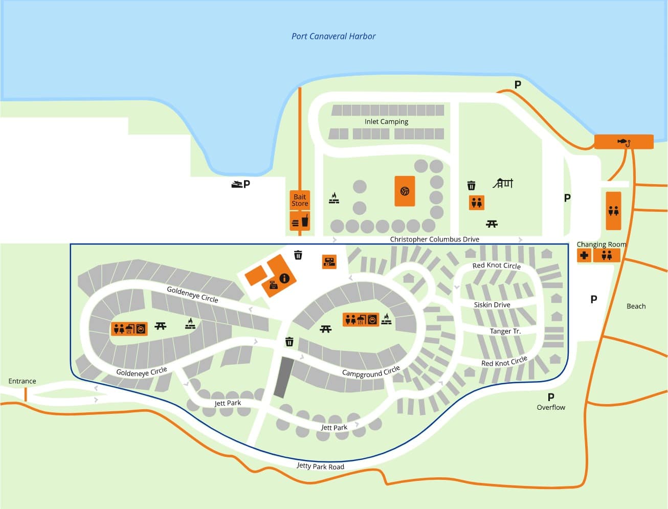 Jetty Park campground offers RV sites, tent sites, and some small very nice cabins for rent. There is beach access, a pier, a camp store, clean community restrooms, a playground, and a restaurant. Each campsite has a picnic table, a cement area for parking, and a built-in grill.